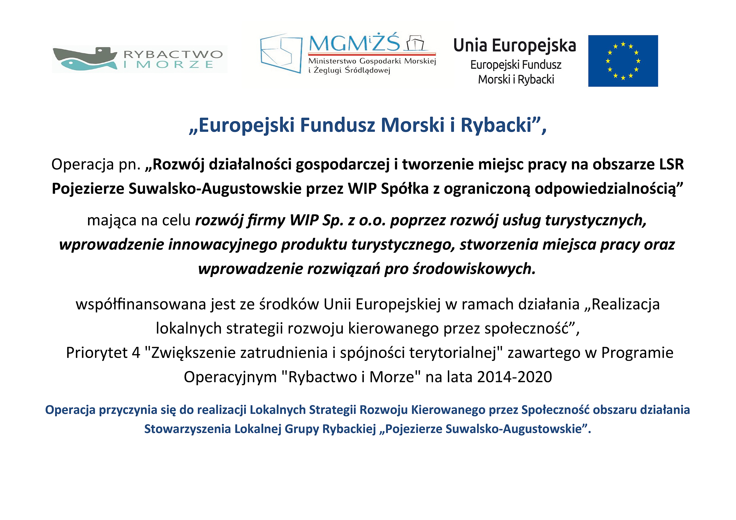 Operacja pn. „Rozwój działalności gospodarczej i tworzenie miejsc pracy na obszarze LSR Pojezierze Suwalsko-Augustowskie przez WIP Spółka z ograniczoną odpowiedzialnością”
